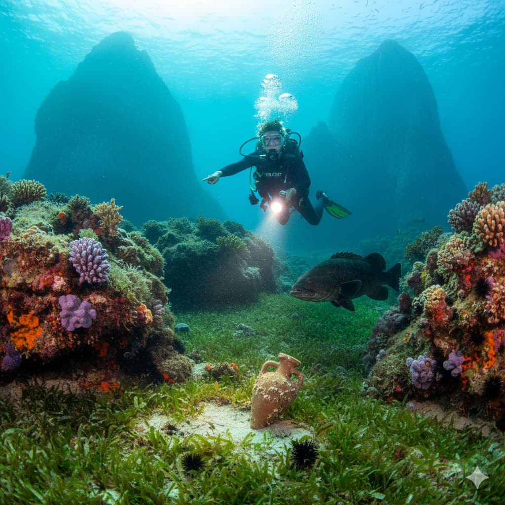 I fondali di Scopello e dello Zingaro sono un richiamo irresistibile. Grazie alla protezione della riserva e alla conformazione rocciosa, la visibilità è spesso eccezionale. Potrete osservare praterie di Posidonia oceanica, banchi di castagnole, saraghi e, scendendo più in profondità, gorgonie colorate e cernie curiose.